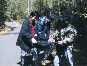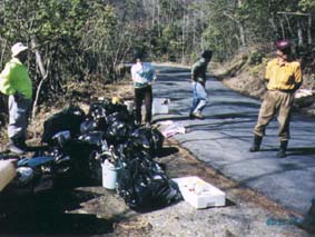 ![]() 清掃活動 20/Mar./2000 今回は快晴! 並滝寺池の湖畔は、マンサクの黄色い花がほころびはじめ ていました。ポカポカ陽気に誘われて散策に訪れる人もちらほら。 ●すっきりしたけど・・・並滝寺池への入り口付近。下刈りが済んで、ずいぶんとすっきりしました。久しぶりにやってきたメンバーも、びっくり。しかし、道路から見えるようになった分だけ、不法投棄されたゴミが目立つようになっています。 ●清掃活動今回は、まず、このゴミを片づけることにしました。前回、倒木の手入れをした湿地への入り口からはじめて、県道の入り口まで。あっという間に、ゴミ袋がいっぱいに。 ●こんなに!約1時間半ほどで、ゴミ袋がこんなに! やはり、空き缶のポイ捨てが多いようですが、中には家庭ゴミを袋ごと捨てているものも。改めて、マナーの大事さを感じました。やはり、子供達が自然環境を満喫できるようにするためには、きれいな山づくりが大切。これからも、少しづつ続けていかなければ。 このあと、藤原園の駐車場でミーティング。これからの活動について話し合いました。4月からも、参加者を募って毎月1回(第3日曜日、13:00〜)開催します。ゴミ拾いや里山の手入れだけでなく、いろいろな企画も楽しみたいと思います。 |