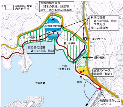 ![]() 並滝寺湖周辺地区整備基本計画 「並滝寺湖周辺地区整備構想」は長期的な整備の将来像。レジャー施設のような大々的な整備は想定していませんが、それでも整備には多くの資金が必要です。東広島市をはじめ関係する機関の協力や合意がなければ実現は困難です。 そこで、当面、観光協会や市民が主体となって、できるところから環境の整備を進めていきたいと考え、平成10年度に、そのための実行計画を検討しました。 そのフィールドとして選ばれたのが、並滝寺池入り口近くの湖畔の樹林地。前年度の現地調査で、湿地が確認されたところです。 ここは、湖畔を通る道路から水辺に近づける場所であるにもかかわらず、樹林地の手入れが行き届いていないことから、雑木が生い茂ったり倒木にはばまれ、水辺に近づくどころか、水辺さえ見えにくい状況でした。 また、わき水が並滝寺池に注ぐ谷筋には湿地が残されていますが、雑木が生い茂り、湿地が消滅しかかっていました。 そこで、この場所を整備し、気軽に水辺に近づいたり、自然環境を学んだり、里山の管理を体験したりしながら、市民が並滝寺池周辺地区の環境に親しみ、その保全や活用を考える場にしようと計画しました。 当面の活動地区の整備イメージです。まず、この範囲の樹林地について、できるところから下刈りや倒木などの整理を行って、水辺に近づいたり里山観察をできるように整備していきたいと計画しています。 同時に、植物の調査などを行って、里山としてどのような形で残していくか、検討していきたいと思います。 さらに、この地区に関心を持つ人々を増やすため、自然観察会や里山活動の体験、自然に親しむレクリエーションなどを、この場所をフィールドとして展開していきたいと思います。 ![]() (拡大してみる) このような整備は、行政に任せ与えられるのを待っているのでは、いつ整備されるかわかりませんし、これまでと同じようにできあがっても使われないものになってしまう恐れがあります。このため、市民が主体になって、並滝寺池周辺地区に関心を持ち、積極的に関わりながら、その保全、整備、活用について考え、提案していく必要があると考えました。 基本計画では、そのための市民参加のイメージについても検討しています。そして、まず関心を持つ人々が中心になって、活動を始めることにしました。 「並滝こもれびの会」は、このような背景から誕生したのです。 「並滝こもれびの会」トップページにもどる ホームページにもどる |